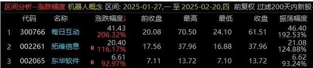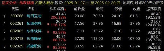 政策与技术共振:宇树科技等企业释放量产信号,叠加特斯拉Optimus机器人量产预期,行业进入商业化落地关键期。近期板块单日资金净流入超百亿,涨停潮频现,容量与弹性兼备。该板块1月27日以来,最大上涨幅度个股是每日互动206%。下面是涨幅前五的个股。